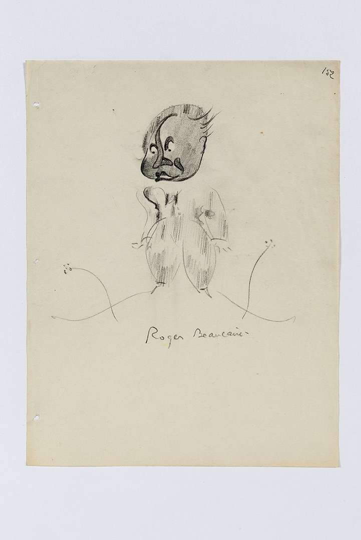 À côté d'une série de portraits de ses amis dans une veine très réaliste (dans un carnet intitulé Les Copains, cf. Dessins, Gallimard, 2006, p. 58-75), Saint-Exupéry excellait aussi dans la caricature (idem, p. 132-146 et p. 166-167). Ce dessin de Roger Beaucaire est inédit. Plusieurs de ses traits sont à rapprocher d'autres croquis : les fleurs de part et d'autre du personnage sont identiques à celles qui flanquent un autre personnage, également croqué au crayon noir (idem, n° 211). Le pantalon bouffant, resserré aux chevilles, est aussi reconnaissable ailleurs (notamment n° 226).