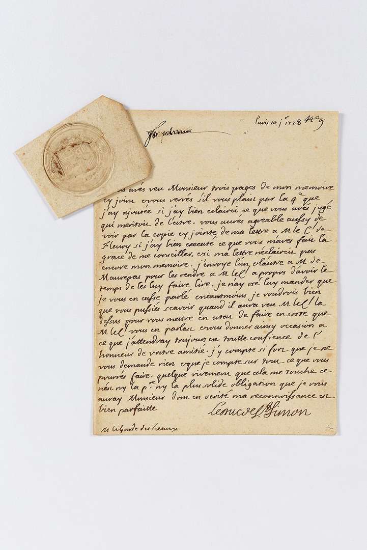 L.A.S. « Le Duc de St Simon », Paris 10 janvier 1728, au Garde des Sceaux (Germain-Louis CHAUVELIN) | 1 page in-4 (portrait gravé joint).