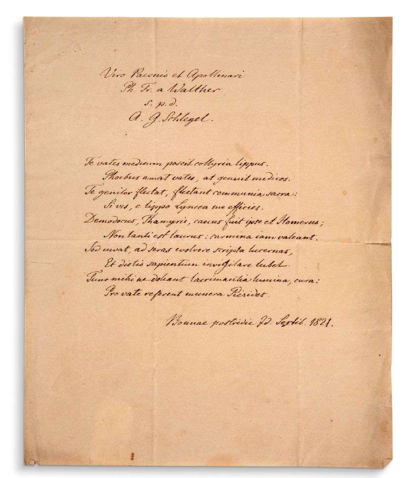 POÈME autographe signé « A.G. Schlegel », Bonn 1821, à Philipp Franz von WALTHER | 1 page in-4, adresse au verso avec cachet de cire rouge aux armes (manque de papier sans affecter le texte).