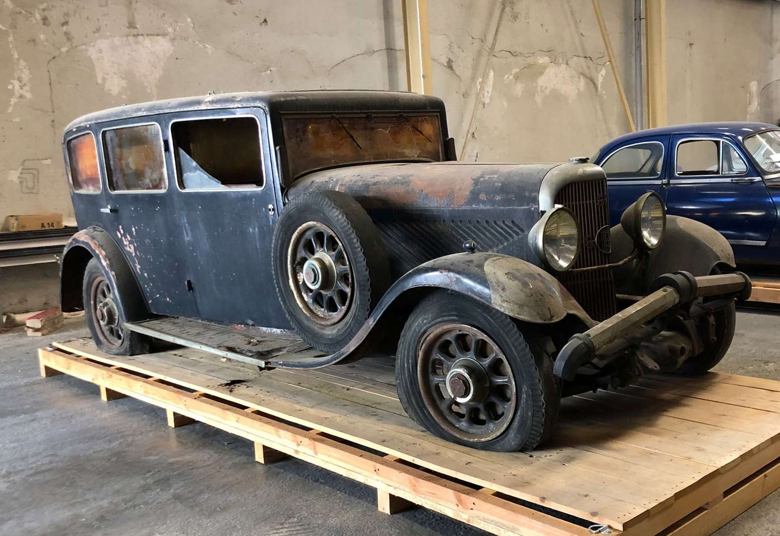 Voiture apparemment complète, détails luxueux : pare-chocs Cromos, phares et feux Marchal, marqueterie, etc.