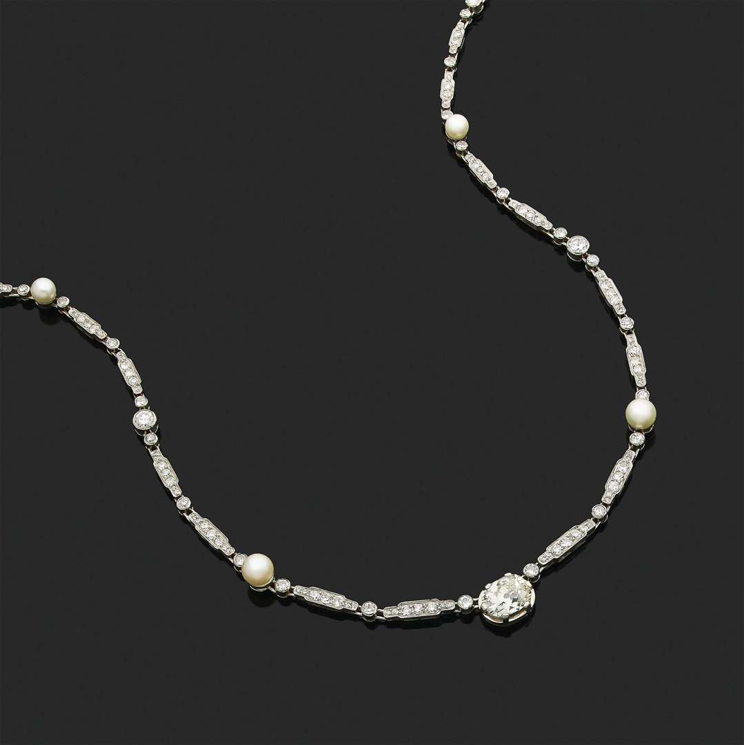 A diamond, pearl, platinum and gold necklace