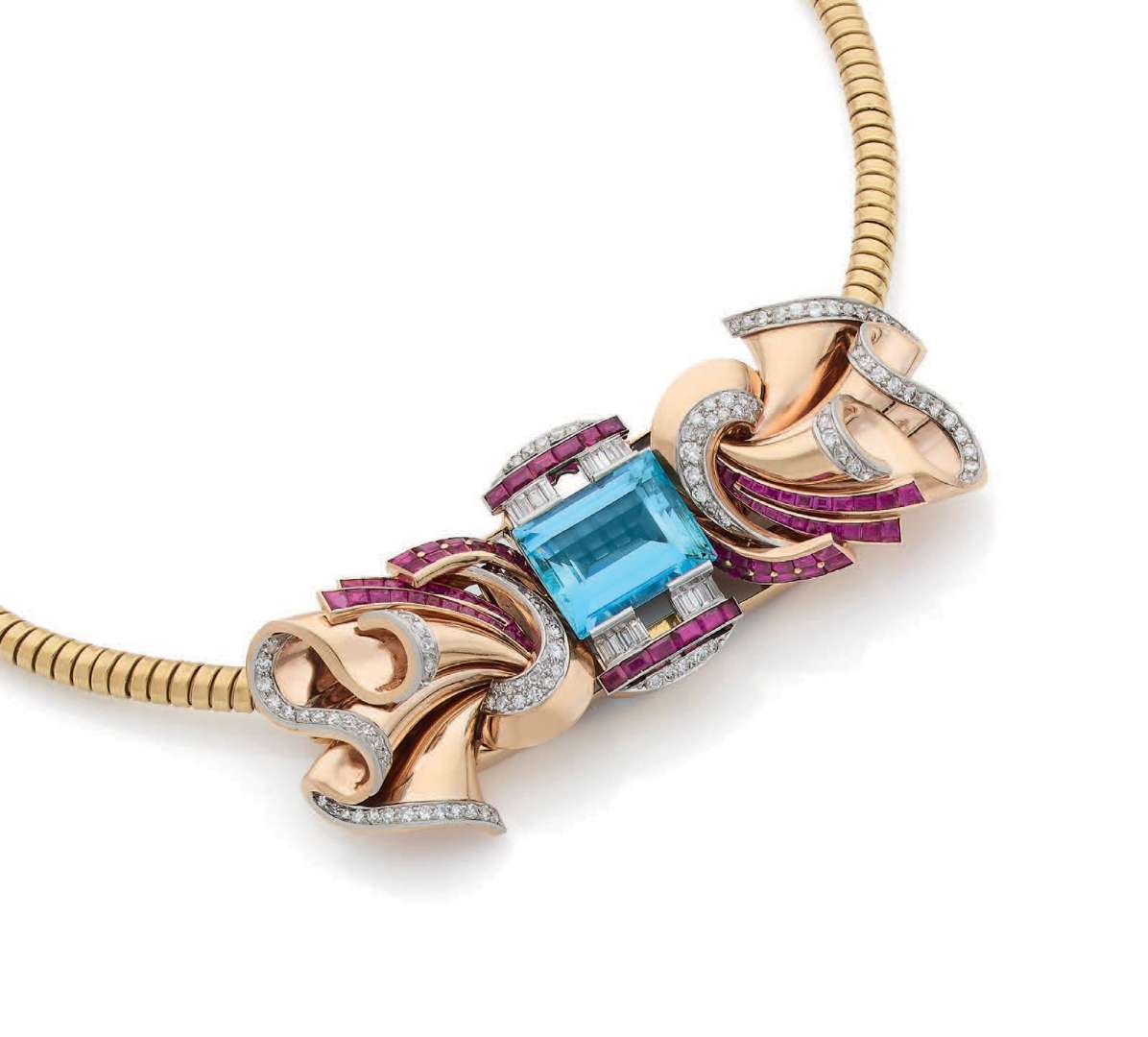 Clip central : importante aigue-marine rectangulaire, rubis calibrés, diamants ronds taille brillant et taille émeraude