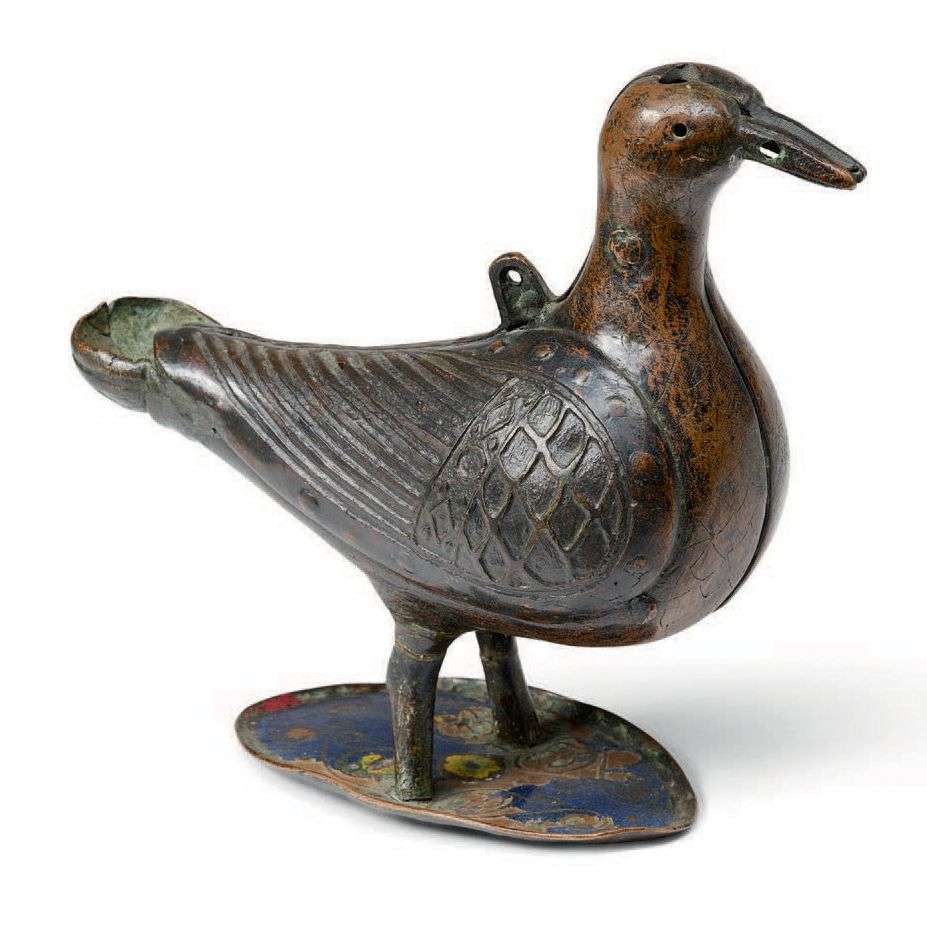 en forme de colombe en cuivre embouti, champlevé et gravé, l'arrière de la queue formant brûle-parfum. Se tient debout sur un plateau ovale émaillé polychrome à décor de rinceaux gothiques. Bélière à la nuque.