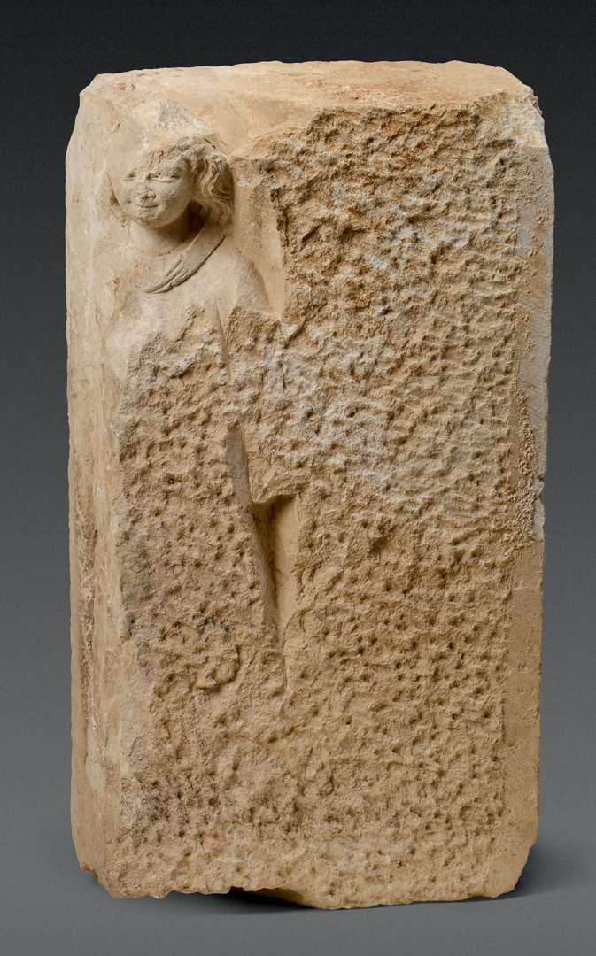 en calcaire oolithique sculpté, bien que réemployé, il subsiste encore des éléments d'origine dont la tête souriante, le col du vêtement, les éléments d'ailes ainsi que le nimbe et la forme générale de l'ange en silhouette.