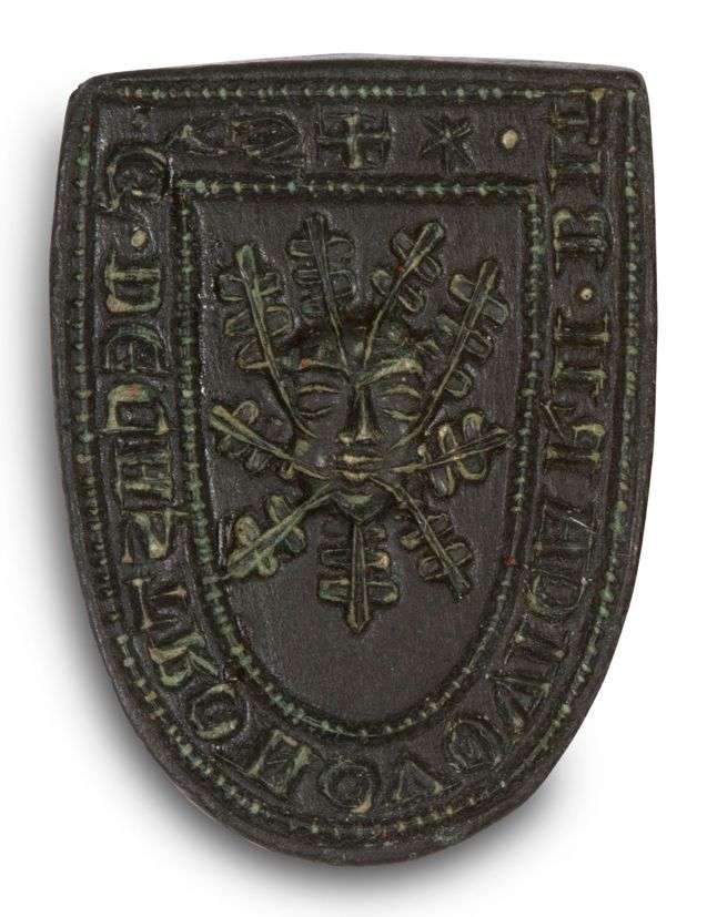 Sceau personnel de Guillaume de Castelnau (alias de Châteauneuf), prêtre, chapelain et précepteur (commandeur) de l'Ordre du Temple, vicaire de Béziers. La matrice en alliage métalique en forme de bouclier, tenon en bélière. La platine gravée en creux d'un visage en masque de la bouche duquel sortent neuf rais feuillagés. Légende gravée en pourtour : « + S/G DE CASTRONOVO VICARII BIT. »