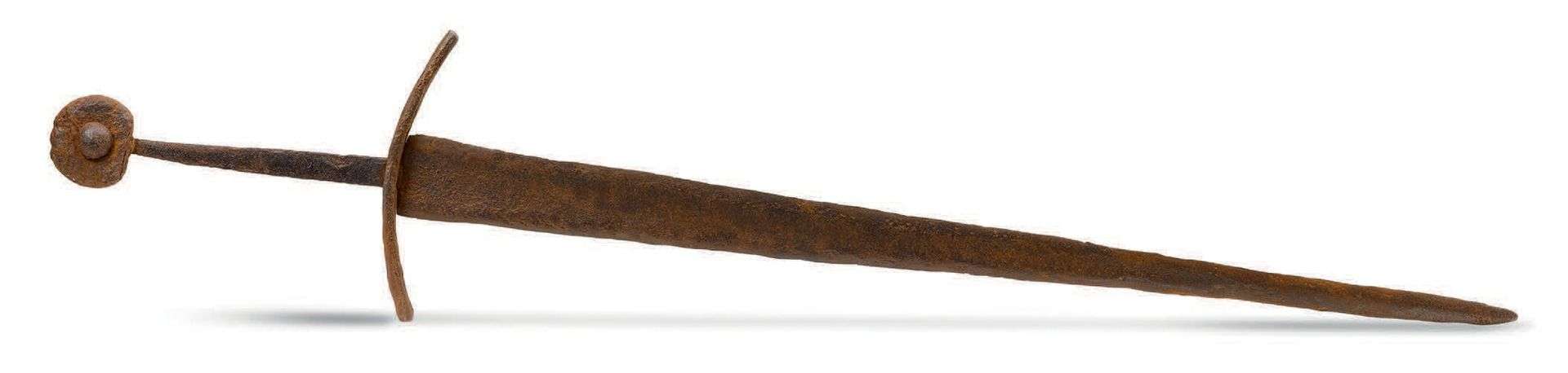 Forte lame légèrement triangulaire de forme convexe sur la longueur offrant un puissant estoc en plus d'un solide tranchant. Garde à deux quillons symétriquement courbes. Pommeau rond à godrons. Belle épée de guerre du XIIe siècle.