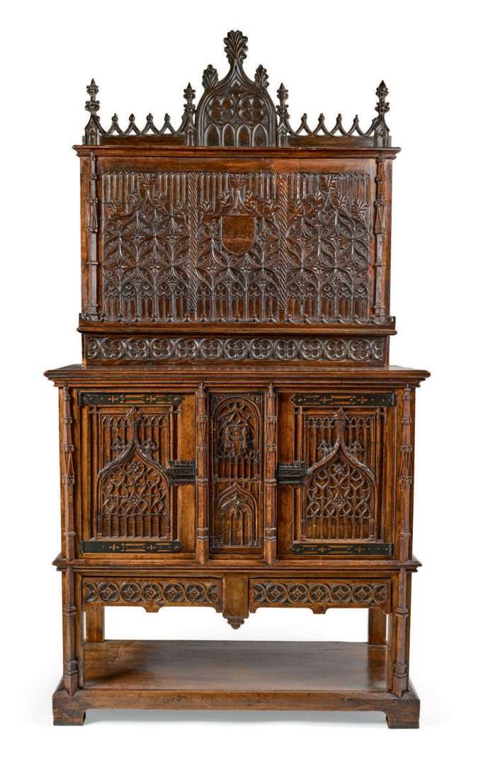 en chêne sculpté à décor de remplages gothique avec arcatures en tiers point, mouchettes, soufflets et pinacles. La partie inférieure ouvrant à deux vantaux encadrant un panneau aux armoiries non identifiées et deux tiroirs. Dosseret haut reprenant une face de coffre ancien et fenestrages moderne.
