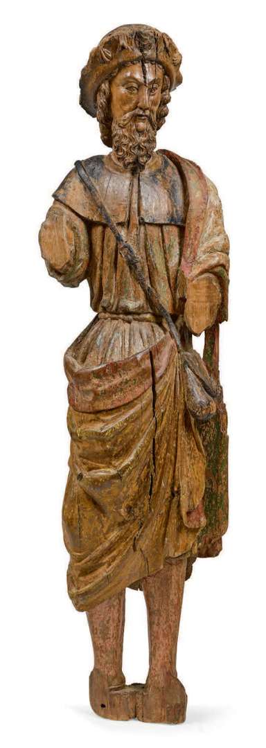 en bois de chêne sculpté et restes de polychromie, en tenue de pelerin de Compostelle.