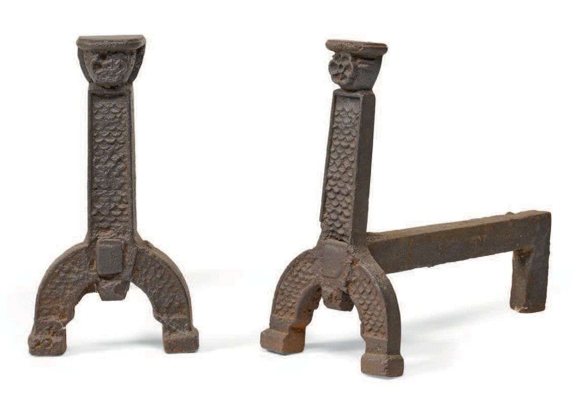 PAIRE DE CHENETS en fer forgé, les montants à fleurs héraldiques et fond d'écailles.