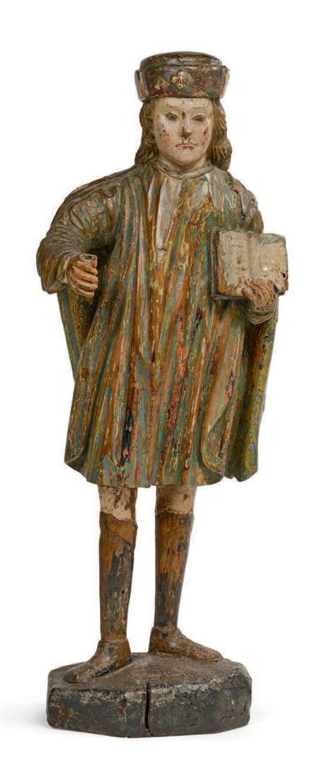 sculpture en bois peint polychrome, il est vêtu d'une tunique verte arrivant à la hauteur des genoux et est recouvert de sa pèlerine. Il porte une paire de bottes. Son visage aux yeux en amande, au nez fin et aux lèvres pincées se dévoile sous une chevelure délicatement ondulée. Sa tête est couverte d'un petit bonnet carré orné d'un fleuron. Il porte dans sa main gauche un livre ouvert, les Évangiles (?), tandis qu'il tenait certainement le bourdon (manquant) dans sa main droite. France, fin du XVe, début du XVIe siècle