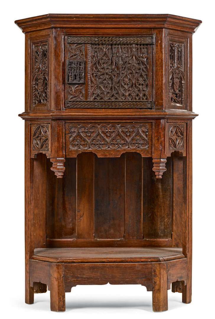 en chêne sculpté à pans coupés et décor flamboyant. Le corps supérieur est composé de quatre panneaux dont deux aux armes et ouvre à une porte centrale et un tiroir bas, autrement appelé yette. Cinq panneaux à orbevoie rythment la ceinture. La partie inférieure est d'époque postérieure, à dos plein, repose sur une base moulurée. France, en partie du XVe siècle.