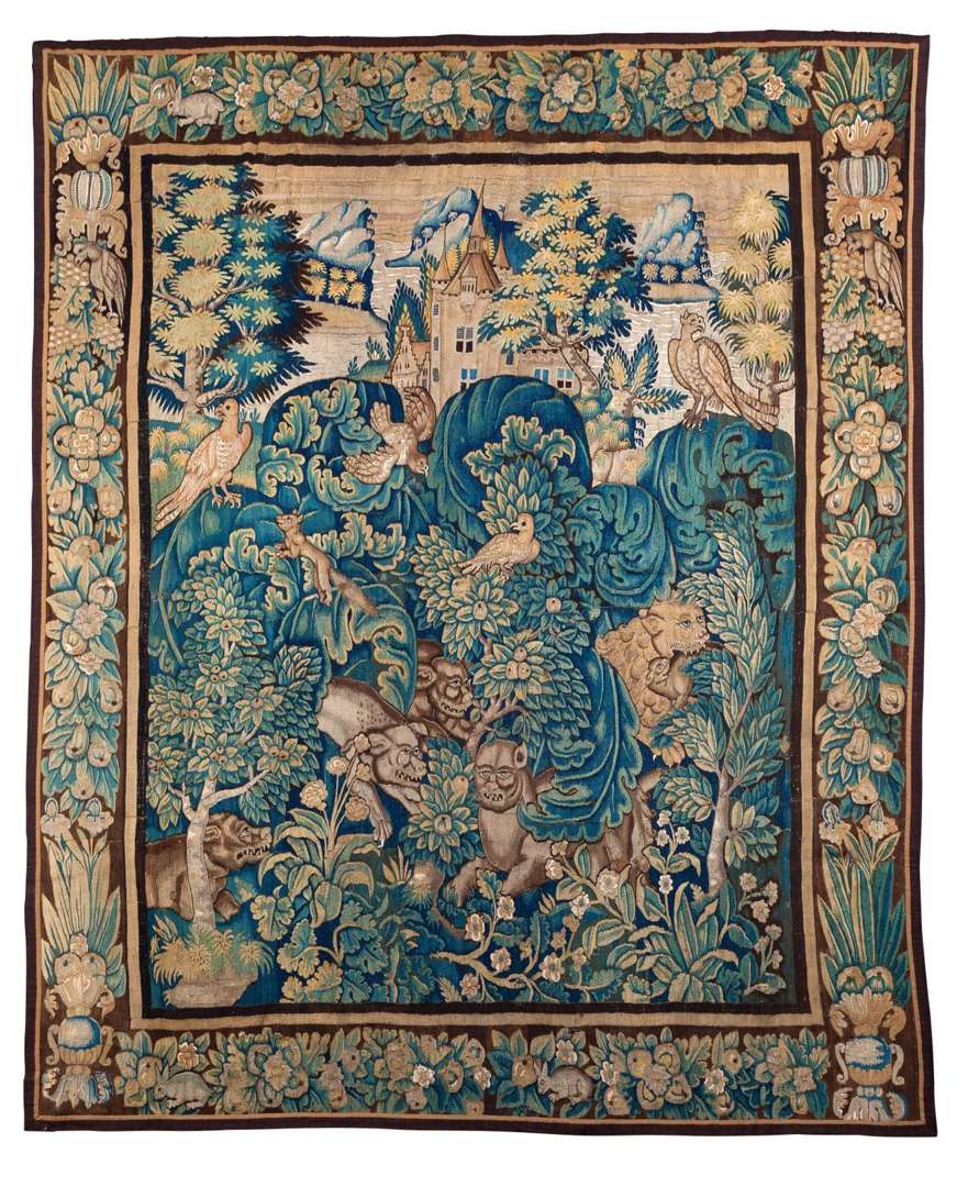 en laine et soie à décor d'aristoloches et de bêtes féroces. Ici trois loups face à un sanglier au centre, en haut à gauche un faucon pèlerin au-dessus d'un écureuil, puis à mi-hauteur à droite un loup-cervier (lynx nord-européen) croquant un lapin, plus haut à droite un Phénix, dans le haut de la tapisserie au centre un château Renaissance, et dans le fond des montagnes. Belle bordure à décor de fleurs, feuilles et fruits.