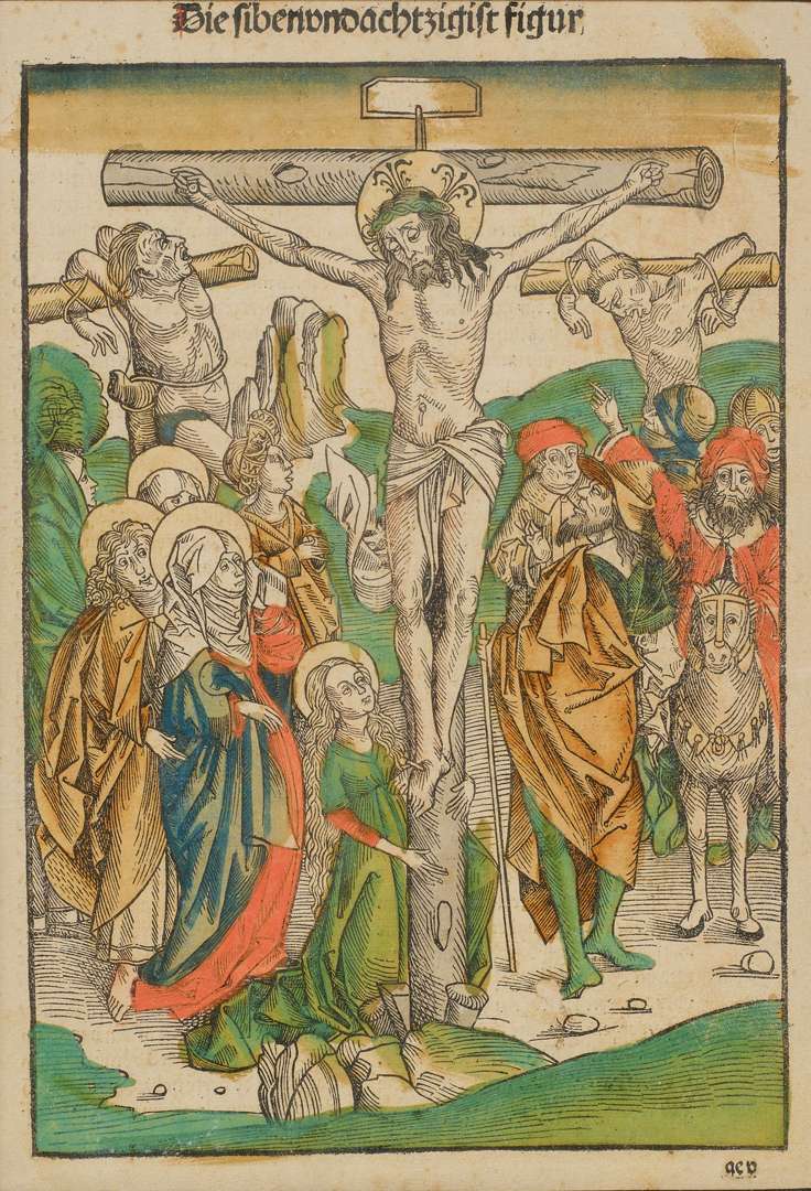 produite d'un bois gravé, rehaussée de couleur. Probablement tirée d'un ouvrage imprimé et surmontée d'une inscription en allemand.