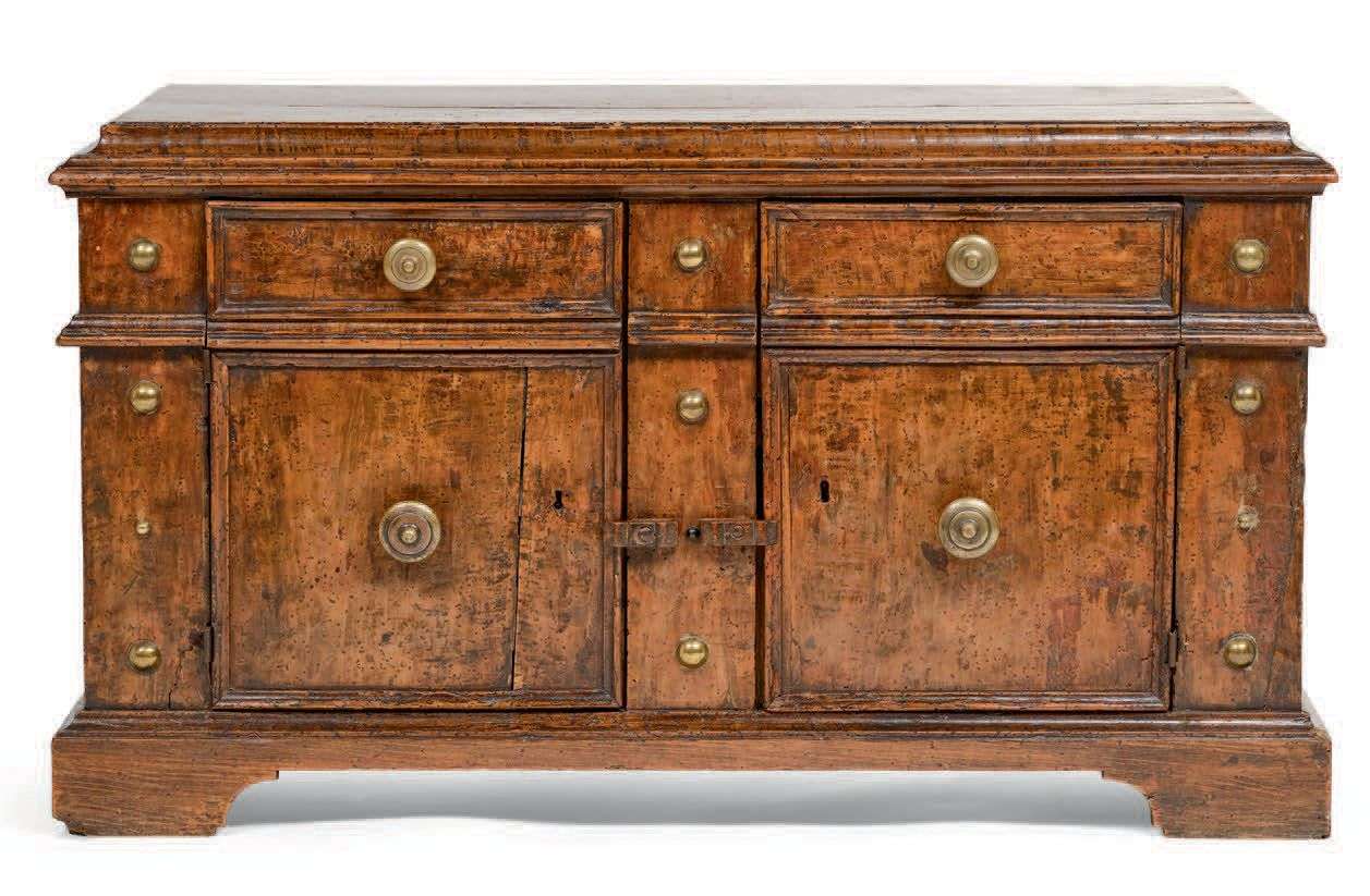 en noyer mouluré. La façade ouvrant par deux vantaux, les montants ornés d'un décor de clous en applique. Poignées en bouton de laiton.