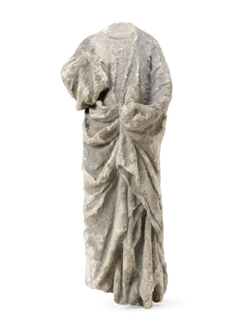 en calcaire sculpté en ronde bosse représentant un saint debout vêtu d'une tunique, la main gauche tenant un livre.