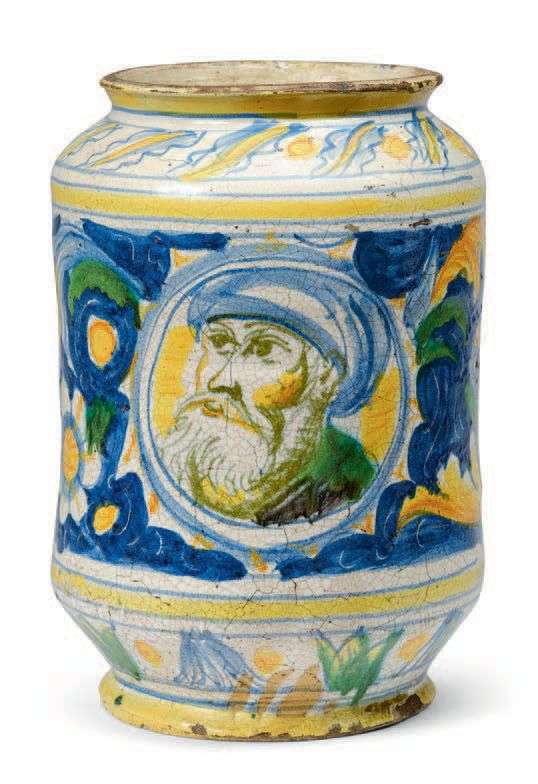 cylindrique à décor polychrome de deux portraits d'hommes, un jeune et un vieux, dans des médaillons ronds à fond jaune sur fond bleu décoré a fiori e foglie.