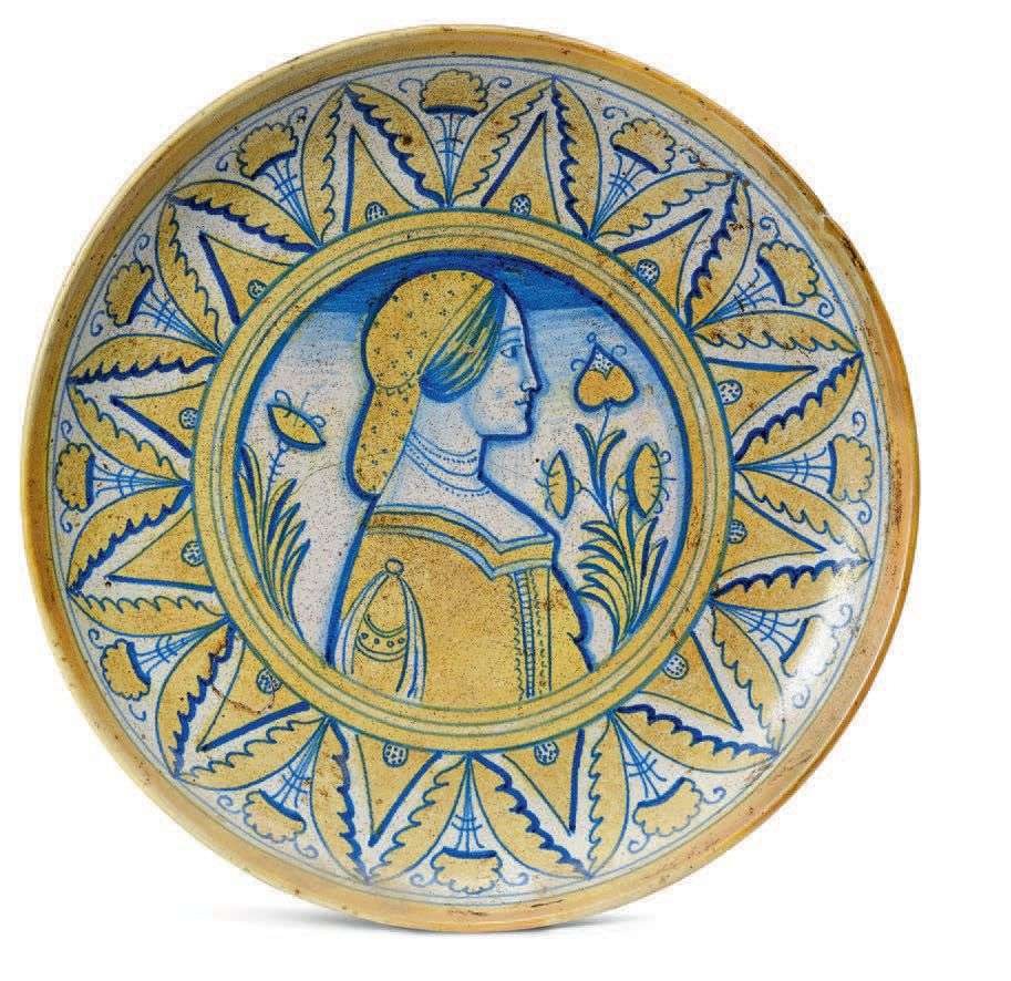 en majolique, au centre un portrait de femme regardant vers la droite dans un entourage de fleurs. Lustre mettalique.