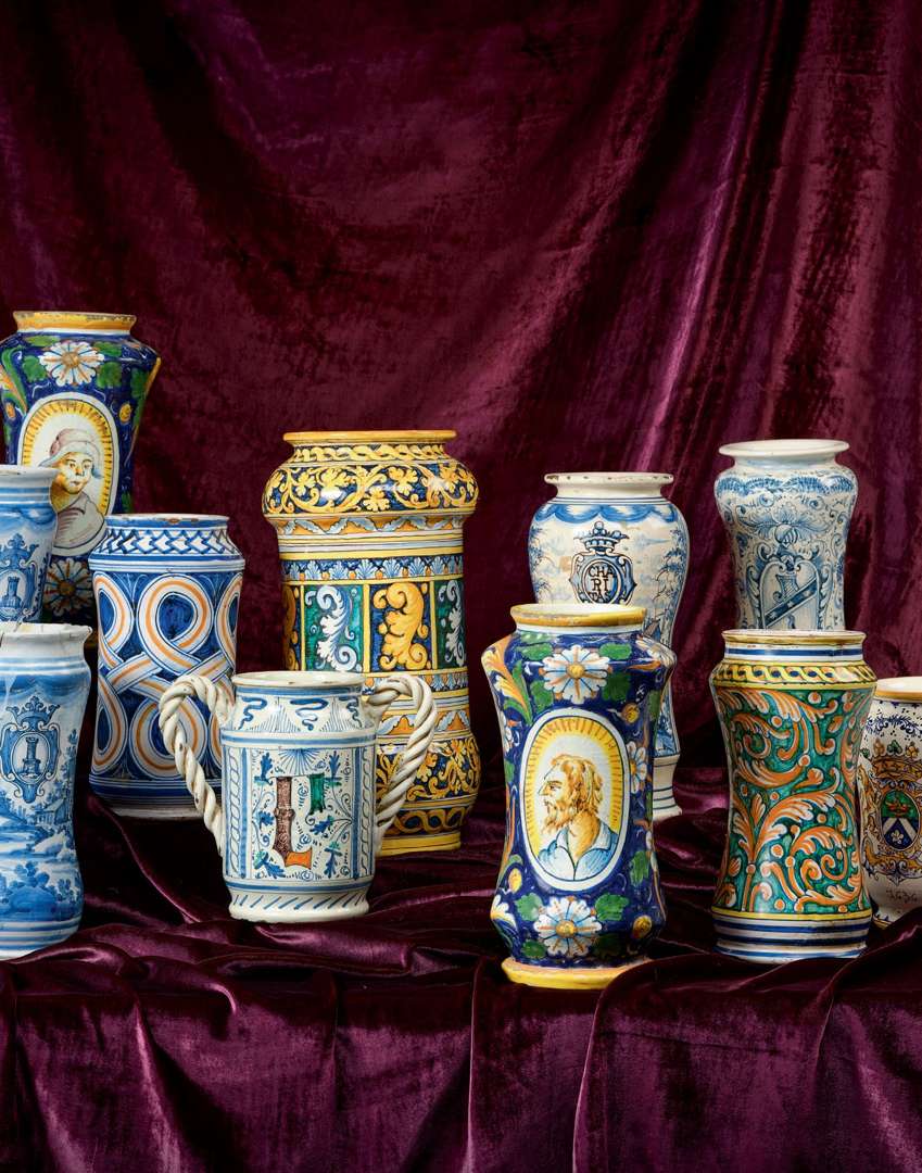 en faïence polychrome. Une paire tronconique à décor de portraits en pendants, une paire en camaïeux de bleu datée 1778, deux en camaïeux de bleu et d'autres dans le style italien du XVIe siècle. Dix pièces.