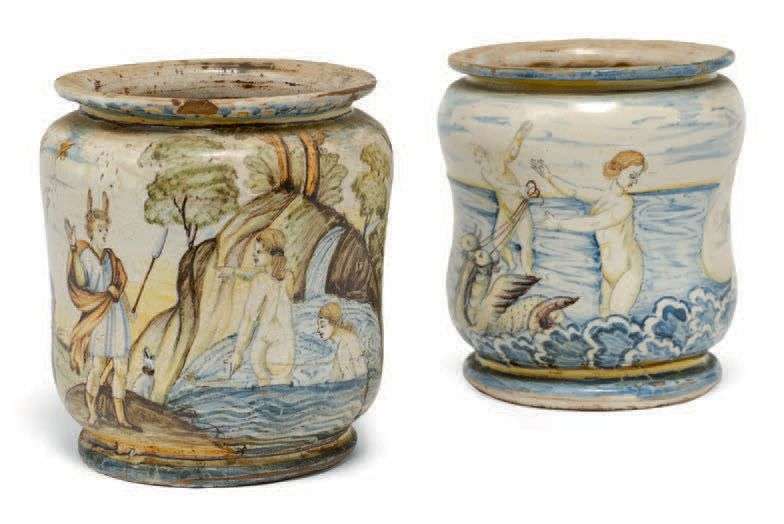 en faïence polychrome à décor de scènes mythologiques : l'un au décor en plein de Diane et Actéon et l'autre au triomphe d'Amphitrite.