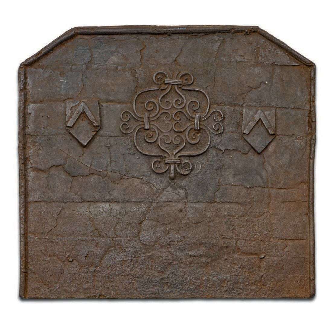 à pans coupés en fonte de fer, représentant une ferrure encadrée par deux petits blasons chevronnés. France, début du XVIIe siècle.