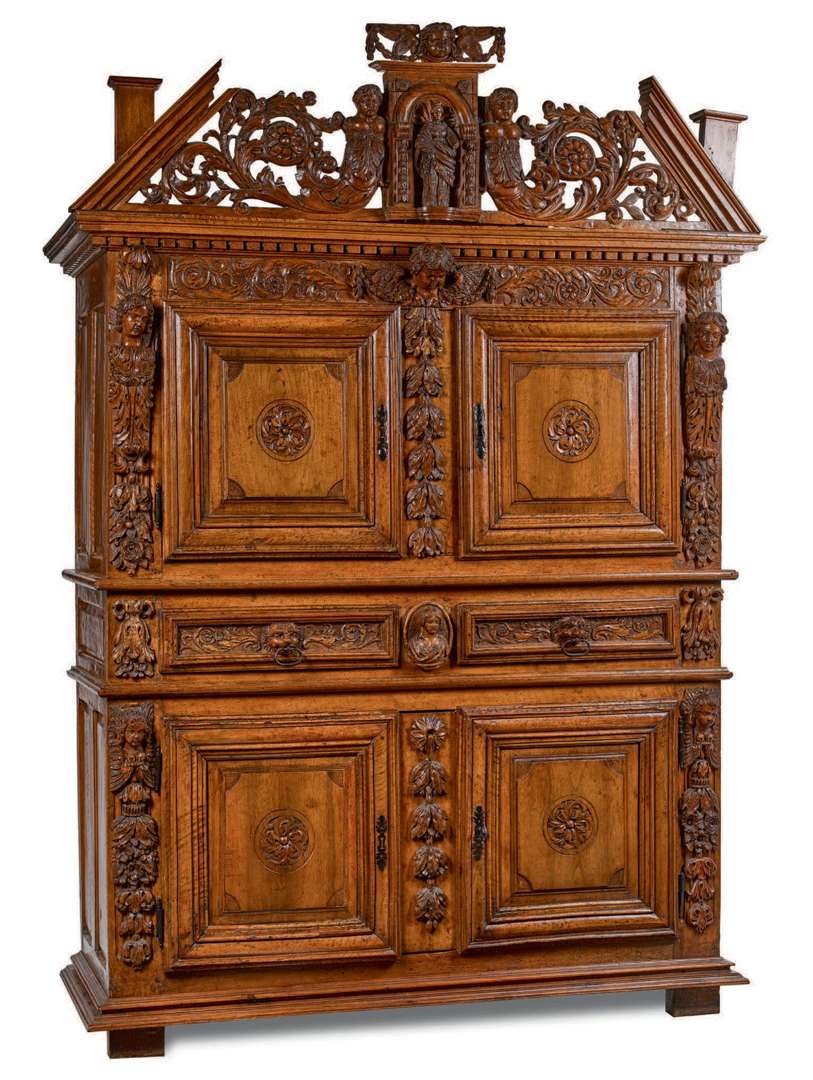 en noyer blond, les quatre vantaux à rosaces sculptées séparés par une ceinture à deux tiroirs à mufles de lions. Les montants ornés de termes sur acanthes, têtes d'angelots et décors de rinceaux en frise. Le fronton est ajouré, richement sculpté et orné en son centre d'une sculpture de la Sainte Vierge Marie.
