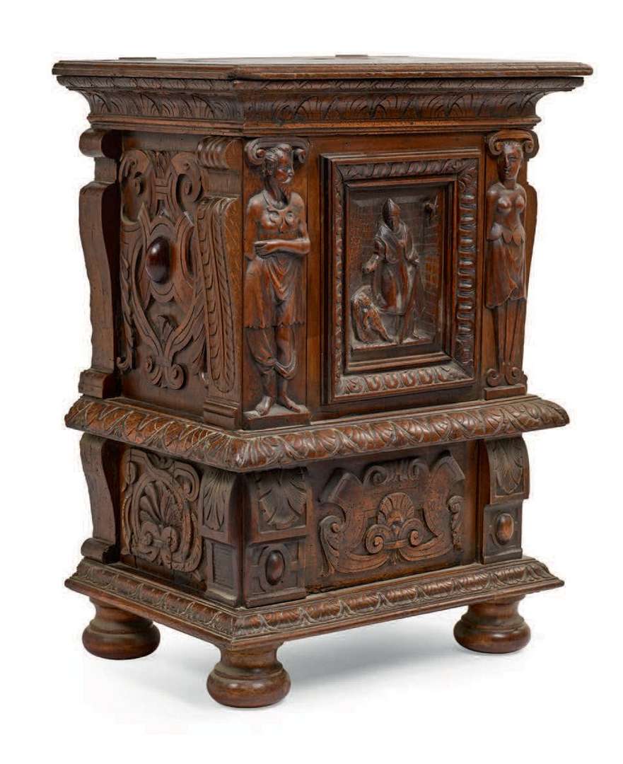 ouvrant à un abattant supérieur, la façade sculptée d'un Saint Nicolas encadré par deux termes. Meuble recomposé avec des éléments de la Bourgogne, début du XVIIe siècle.