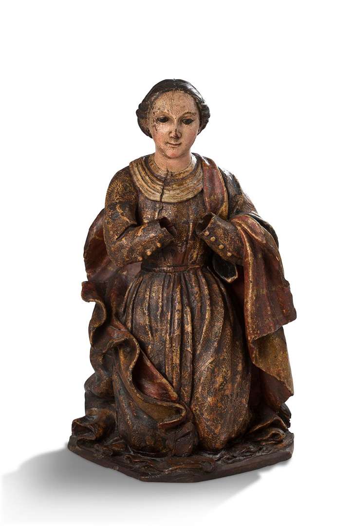 en bois sculpté en ronde-bosse, polychromé et doré, yeux en verre. Elle se tient agenouillée et les mains jointes.