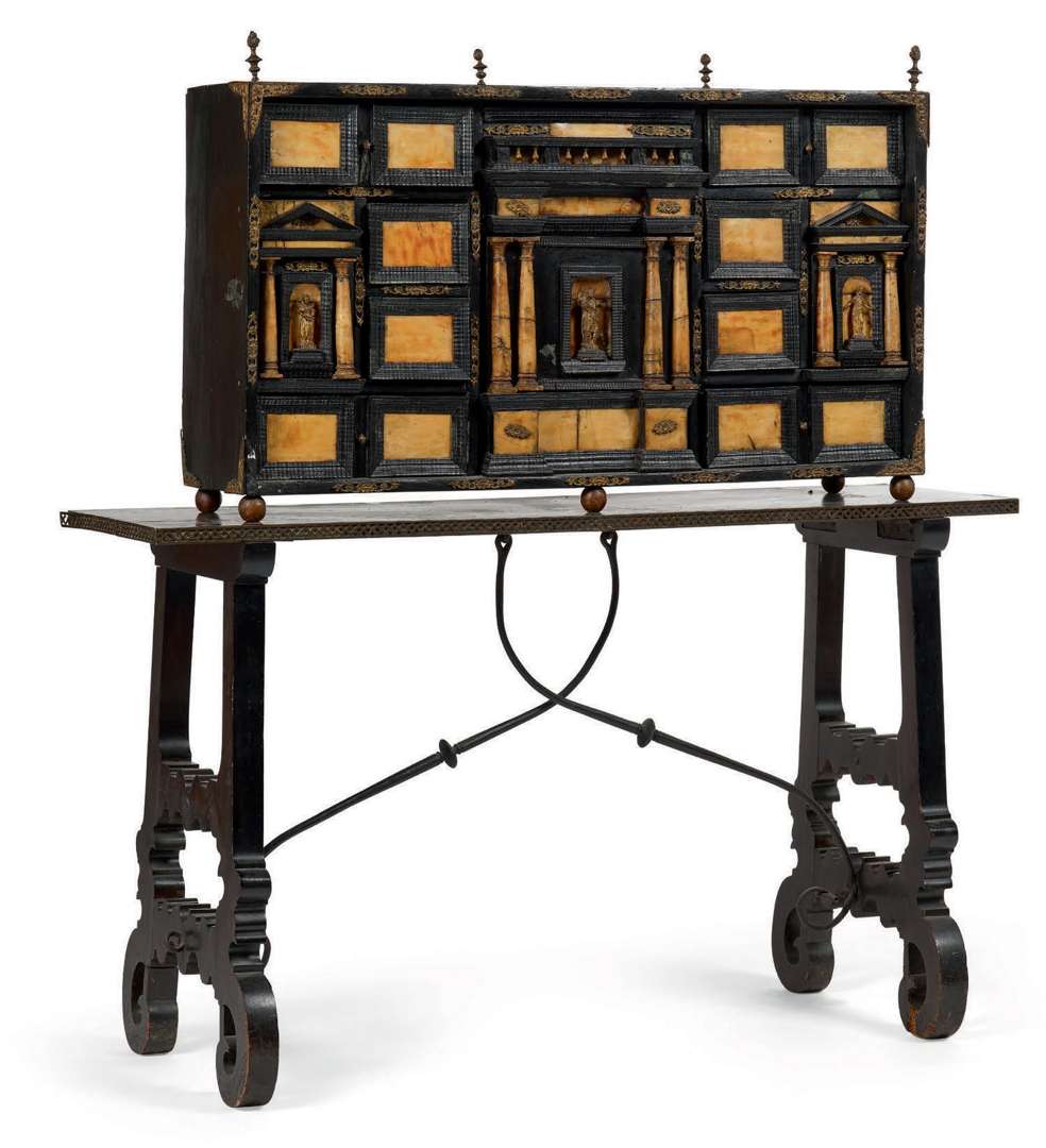 en bois laqué noir, la façade en forme de temple à quatorze tiroirs et panneau central dévoilant deux autres tiroirs à placage de corne blonde à l'imitation de l'ivoire et de l'écaille de tortue. Trois figures de bronze doré animent la facade. Repose sur cinq pieds boules.