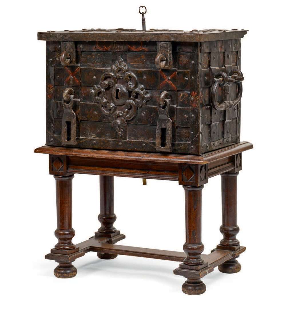 rectangulaire en tôle de fer et fer forgé. Serrure forte à cinq pênes sous une platine finement gravée. Rangement intérieur renforcé à une clef. Poignées latérales. Décor peint.