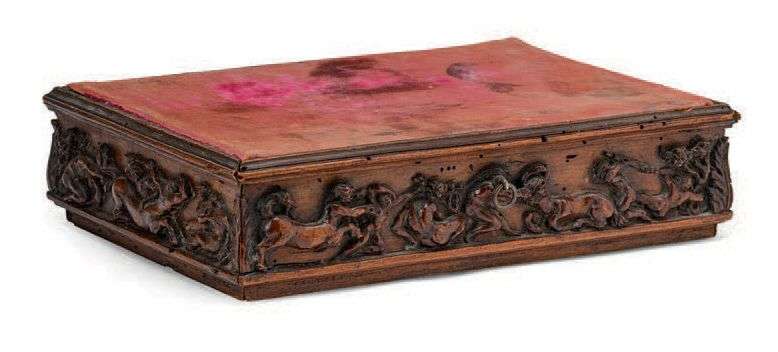 de bois sculpté rectangulaire pouvant former socle. Les quatre côtés sculptés de bas reliefs représentant des scènes de batailles entre les Lapithes et les Centaures, feuilles d'acanthe aux écoinçons. La face ouvrant à un tiroir. Dessus de velour cramoisi (changé).