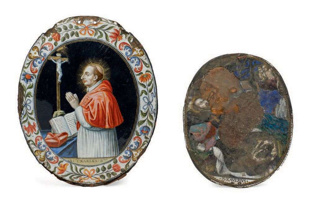 On y joint une autre plaque du même : l'extase de Saint-François Xavier. Plaque ovale en cuivre émaillé polychrome