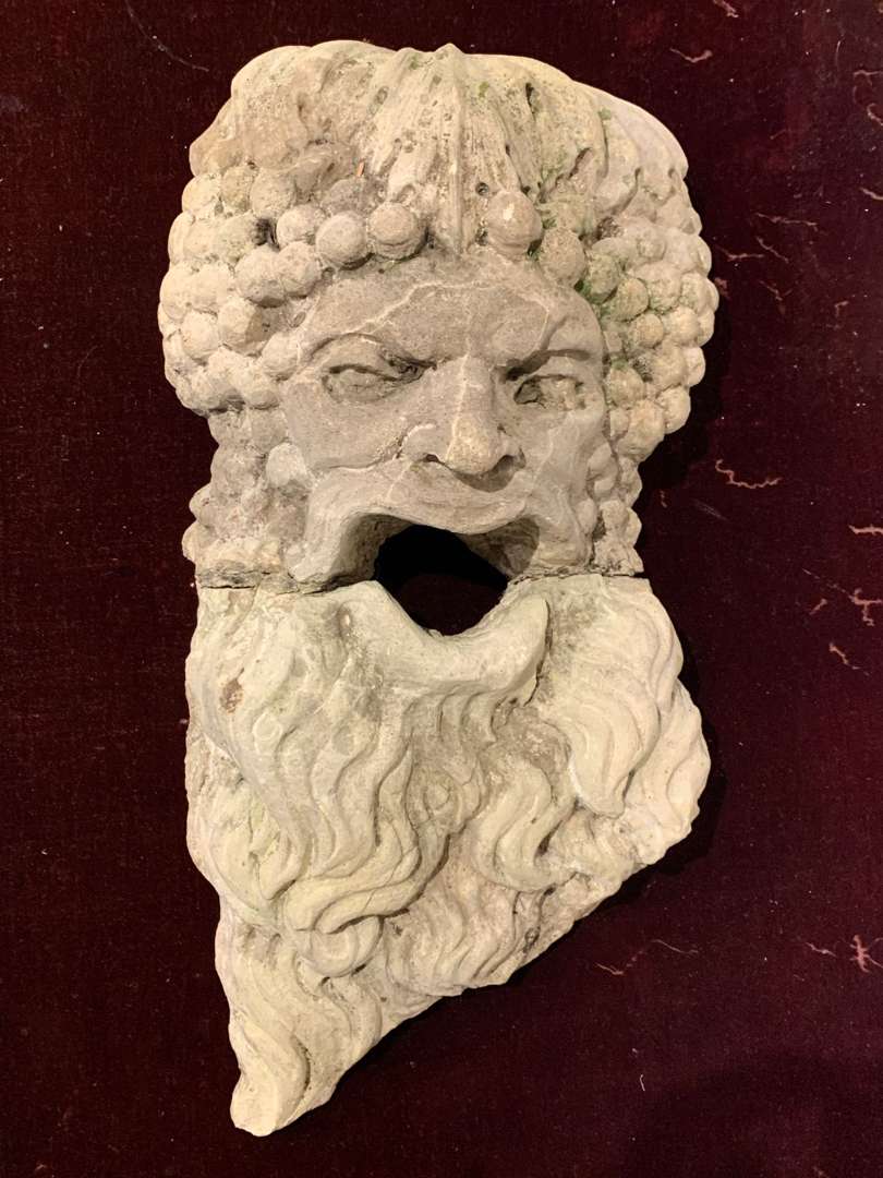 en pierre sculptée en forme de tête de Bacchus barbu, les cheveux en pampres de vigne.