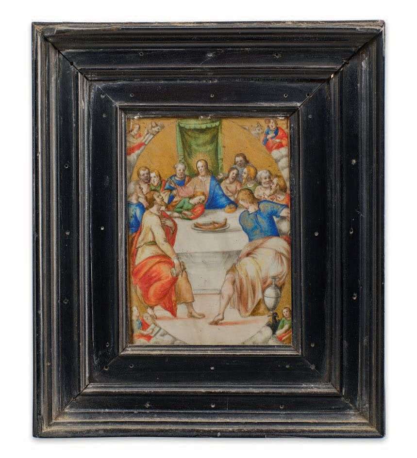 représentant la Sainte Cène encadrée du tétramorphe en polychromie.