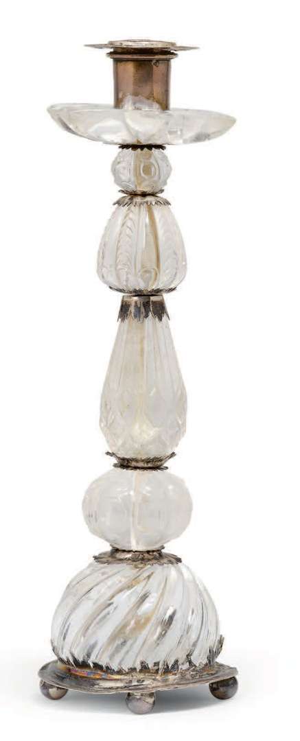 en cristal de roche, la monture en argent. Le fût de six pièces de cristal de roche taillé alterné de pièces d'argent. Bobèche (postérieure) en argent à décor de rinceaux repoussés et gravés. Piètement d'argent sur quatre pieds boules. Probablement Augsbourg, XVIIe siècle, remonté à la fin du XIXe siècle.