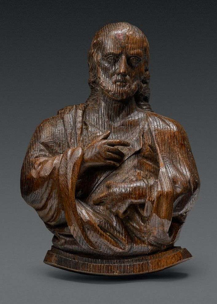 en buste d'applique de chêne sculpté, peut-être Moïse tenant les Tables de la Loi (disparue). Dos plat à mortaise.