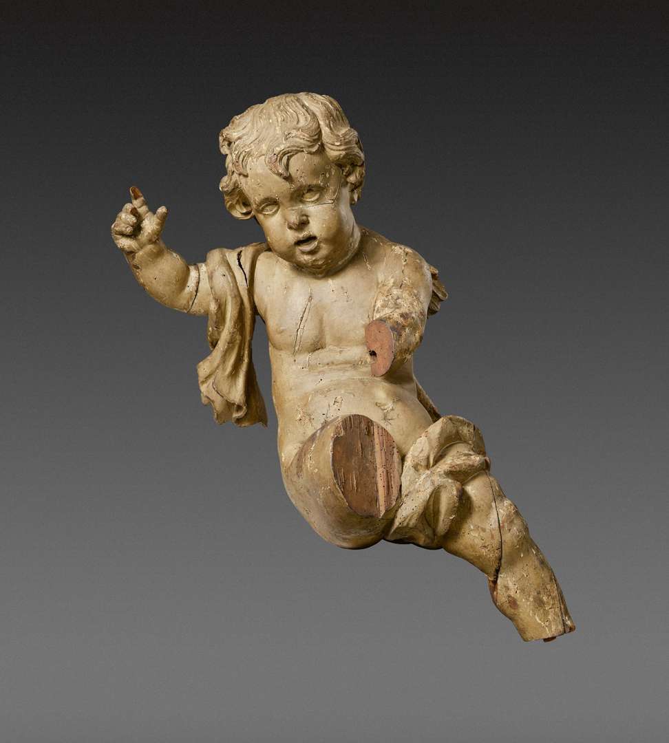 en bois sculpté en ronde bosse et laqué gris en provenance d'un retable d'autel.