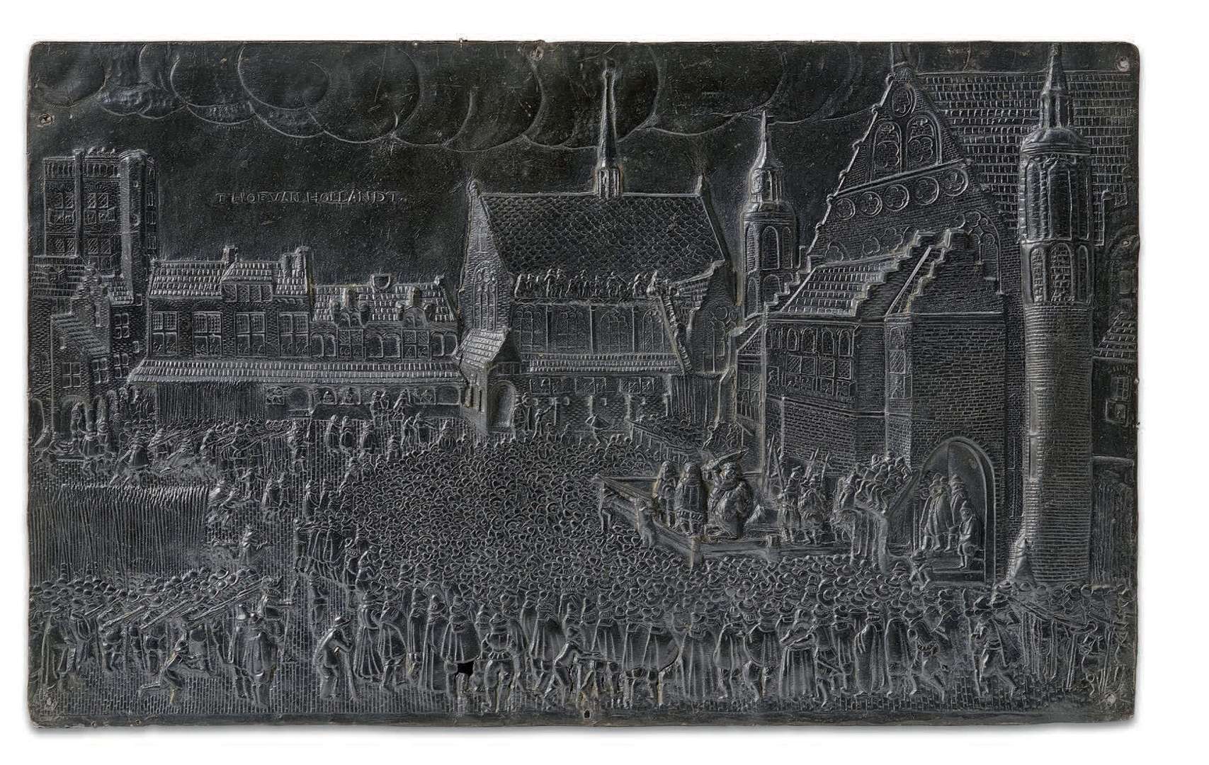 représentant en léger relief l'exécution de Johan van Oldenbarnevelt dans le Binnenhof à La Haye le 13 mai 1619 d'après la gravure de Claes Jansz Visscher.
