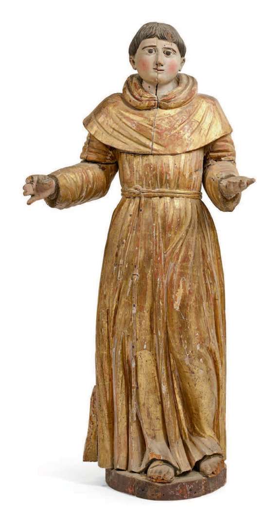 sculpture en bois doré et peint polychrome. Il est représenté debout, dans son vêtement de franciscain. Les mains écartées. Dos évidé.