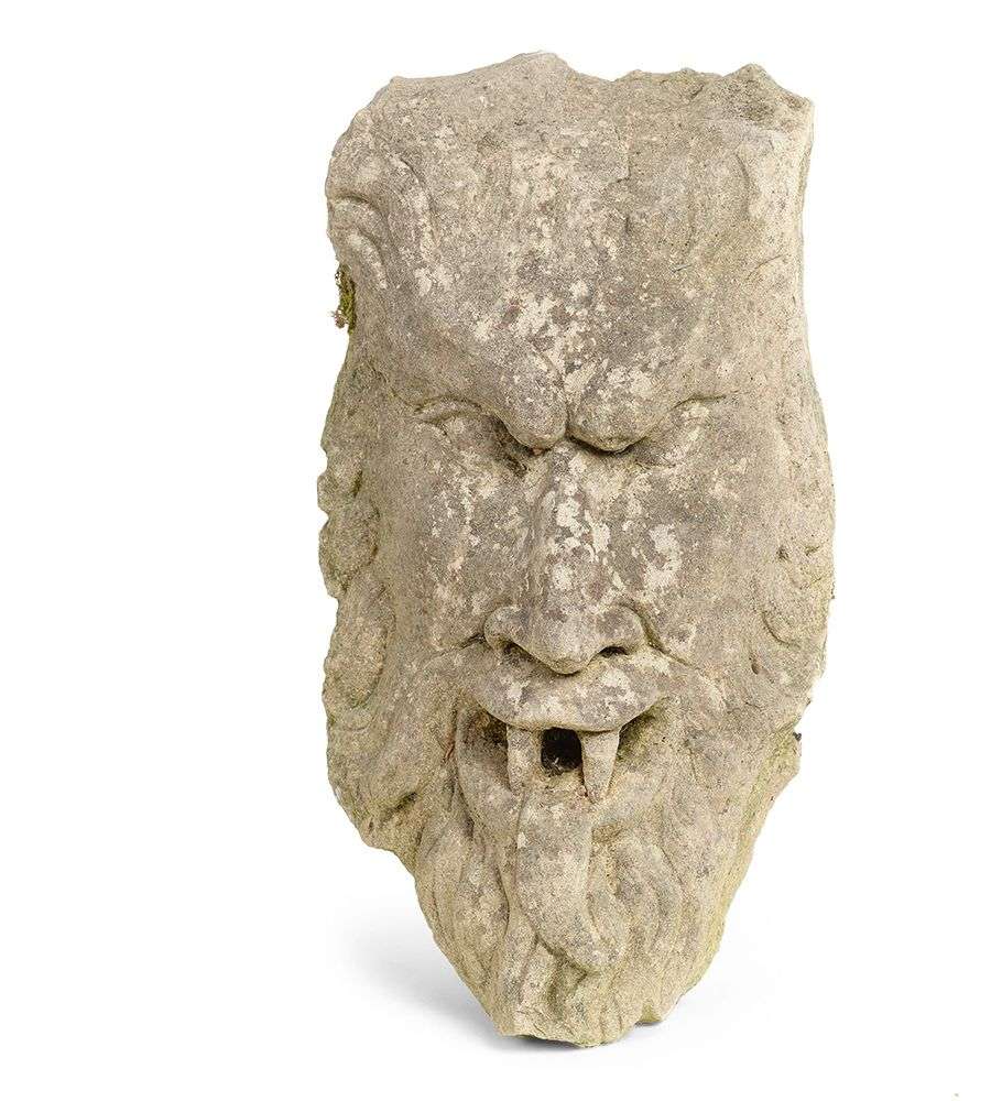 sculptée en pierre, il est représenté grimaçant, tirant la langue.