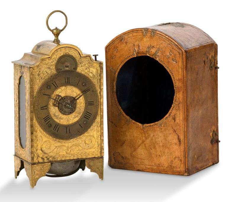 à sonnerie et fonction réveil, la caisse à plaques de cuivre doré et richement gravé de rinceaux fleuris. Le cadran circulaire à chiffres romains surmonté d'un cadran d'ajustement Avance/Retard. Aiguilles en fer forgé, le dessous comprend le timbre visible entre quatre pieds de cuivre dorés aux angles. Au dessus une bélière de suspension. Les côtés ajourés de verre permettant d'apercevoir le mécanisme.