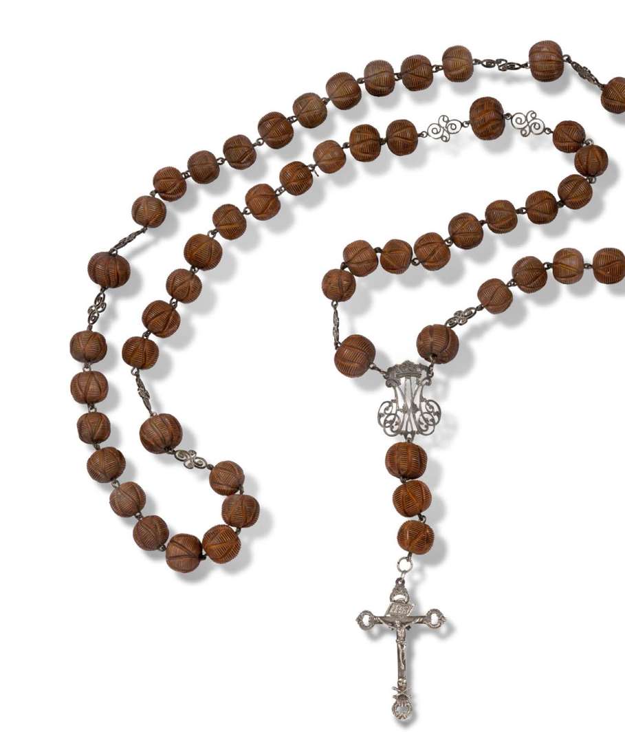 à la monture en argent et grains de bois tourné et sculpté, la croix au Christ crucifié en relief, titulus et crâne d'Adam, sur le revers de la croix une représentation de Notre Dame del Pilar. Au coeur : un monogramme marial A(ve) M(aria) couronné d'argent ajouré et gravé.