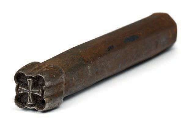 en acier (pour cachets) d'une Maison mère Hospitalière de l'Ordre de Malte. Symbole de la croix hospitalière, timbre en creux. Manche octogonal légèrement tronconique.