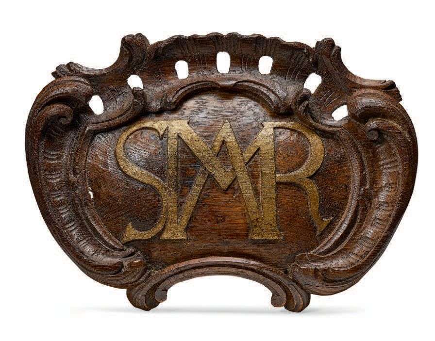 en chêne sculpté convexe en applique à décor de cartouche dont le centre est sculpté en relief SMAR pour : Ave Maria et Salve Regina.