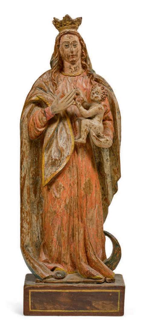 en bois sculpté et peint polychrome, la Sainte Vierge se tient debout, couronnée, l'Enfant Jésus dans ses bras lui offre un fruit. La lune est sous ses pieds. Sur un entablement.