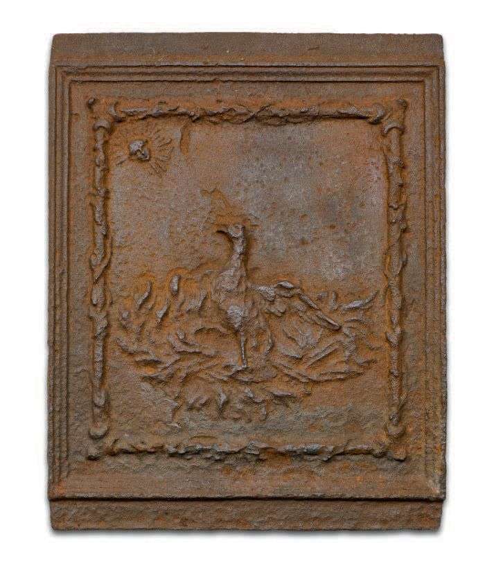 rectangulaire en fonte de fer représentant un phénix sur son immortalité fixant un soleil posé dans l'angle dextre du chef dans un encadrement. Probablement les armoiries de la famille de Fénis en Limousin.