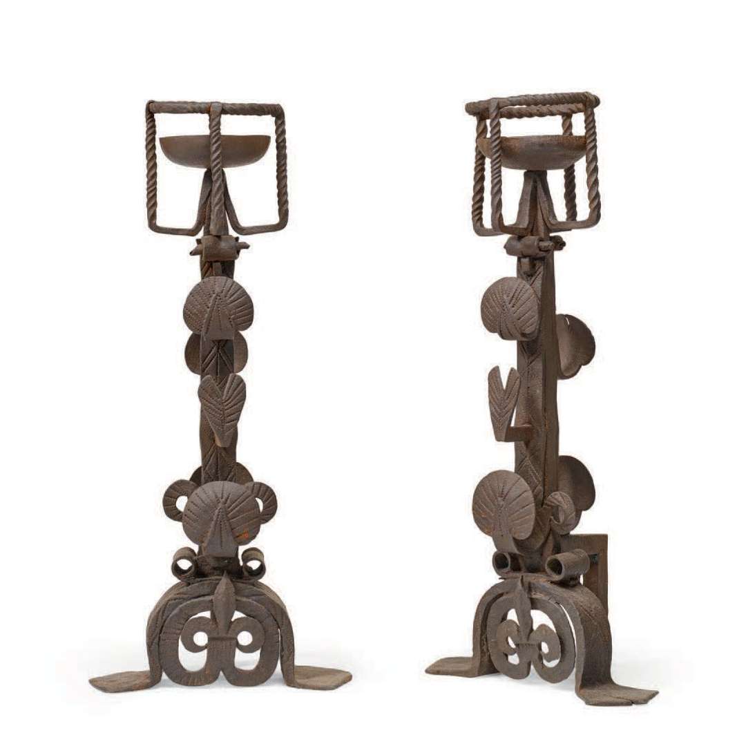 en fer forgé, torsé et gravé. Hauts montants à landiers pris dans une armature torse. Cinq crochets en forme de coeur et coquilles, trois sur la face, deux à l'arrière. Le piètement à fleur de lys.