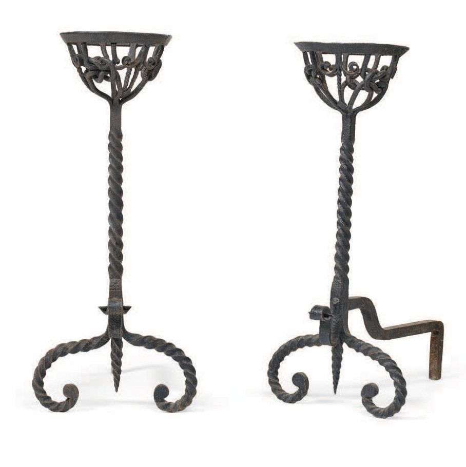 en fer forgé torse, les landiers ajourés richement travaillés à motifs de noeuds. Un crochet en façade.