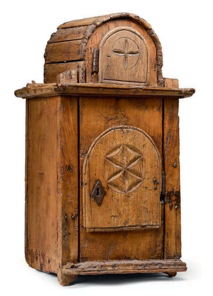 en bois de résineux. La façade ouvrant par deux portes, les vantaux sculptés au couteau d'une rosace stylisée.