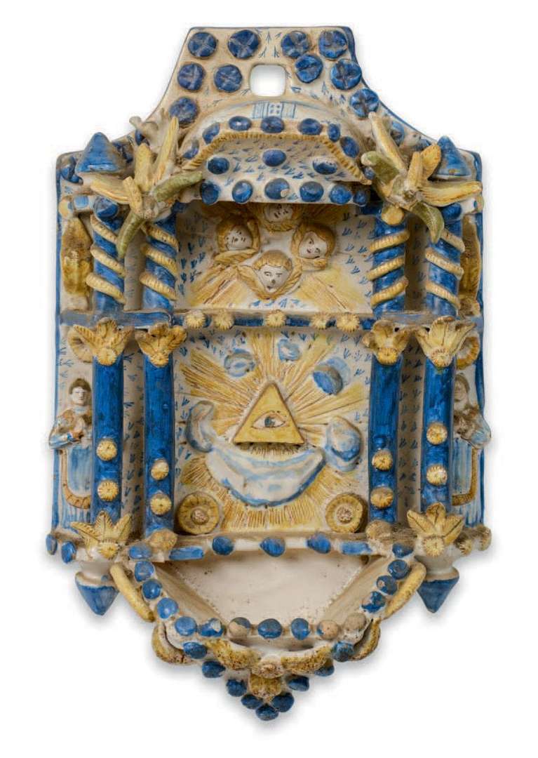 en faïence émaillée polychrome représentant au centre le triangle de la Trinité surmonté par des angelots. Les côtés flanqués de colonnes.