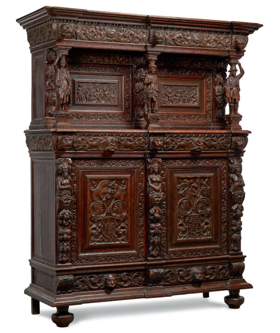 en chêne sculpté au naturel. La partie supérieure à corniche de rinceaux et mufles de lion, cartouches gravés « Anno 1669 ». Elle ouvre à deux vantaux sculptés de scènes paysanes alternées de termes de femmes musiciennes. La corniche appuyée sur trois personnages formant colonnes. La partie basse ouvrant à quatre tiroirs et deux vantaux richement sculptés de médaillons et armoiries.